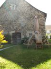 Terrasse devant l'entrée principale, table de jardin avec parasol et barbecue derrière la maison.